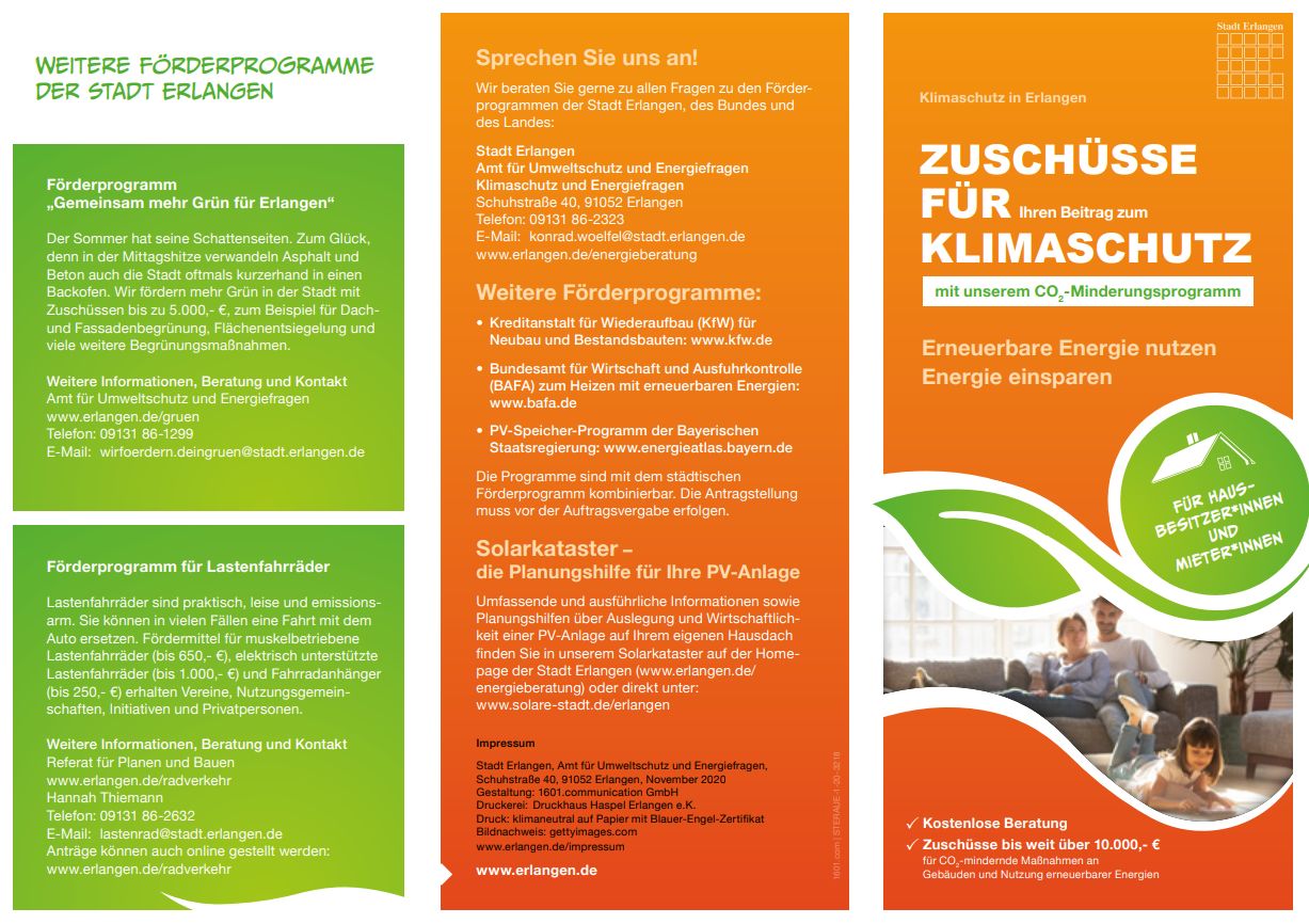Die Stadt Erlangen hat ein Förderprogramm aufgelegt. Für eine PV-Anlage mit einer Leistung von bis zu 30 kW gibt es einen Zuschuss von 150 € je kW. Aber auch Stromspeicher, Wärmedämmungsmaßnahmen und effizente Heizungssysteme werden gefördert. Näheres hier, weitere Details in der Förderrichtlinie.
